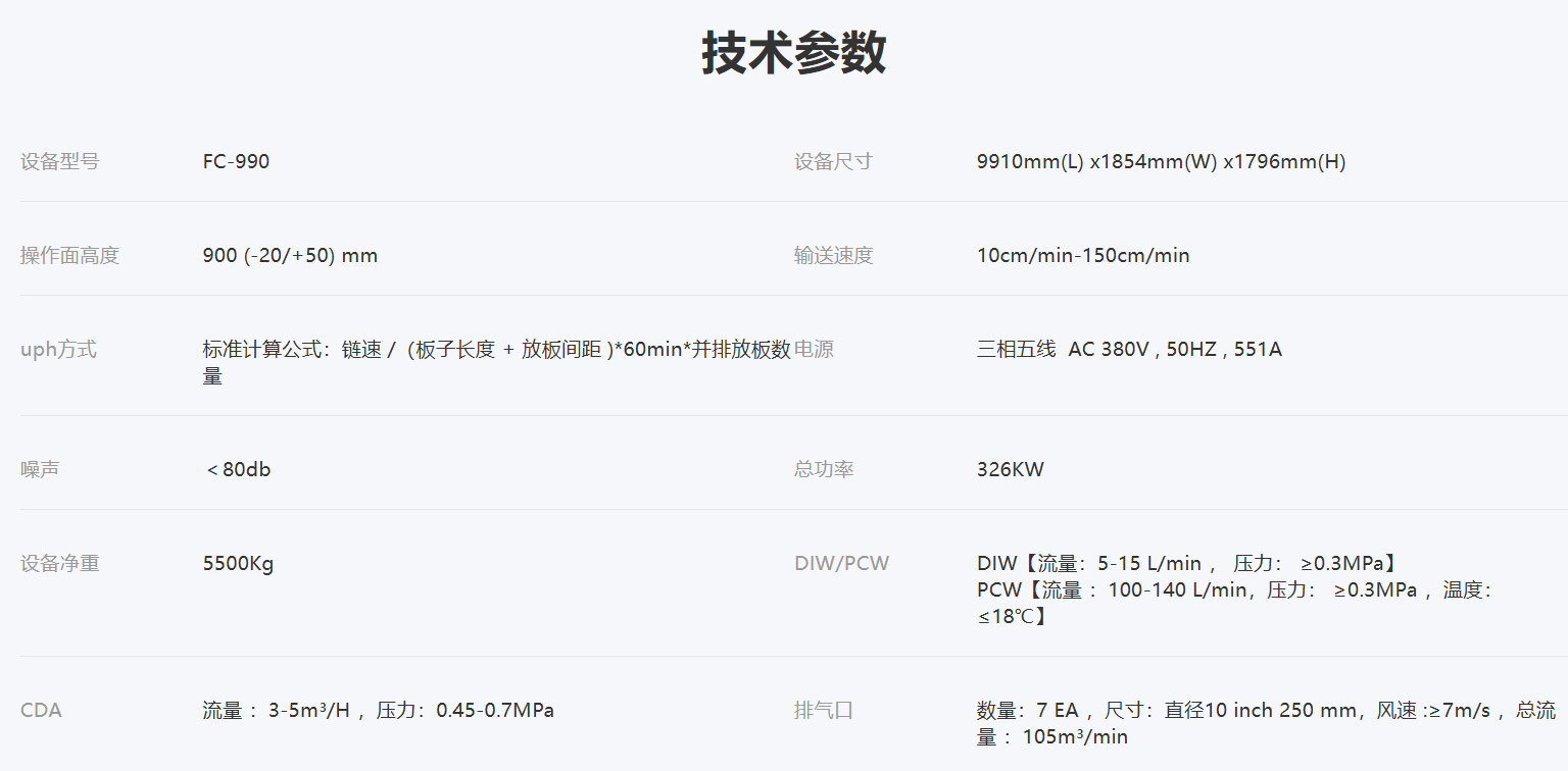 6800mm(L)x1860mm(W)x1956mm(H) Operating Surface Height: 900 (-20/+50) mm Conveying Speed: 10cm/min-150cm/minUPH: Standard Calculation Method Chain speed/(board length + board spacing)*60min* Number of parallel boards power supply: three-phase five-wire 3 Phases 5 Lines, AC 380V, 50HZ, 313A noise: < 80db Total power: 189kW Equipment net weight: 3600kgDIW/PCW: DIW: (flow rate:) PCW: (Flow rate: 100-140L/min, pressure: ≥0.3MPa, temperature: ≤18℃) CDA: Flow rate: 3-5m³/h, pressure: 0.45-0.7MPa Exhaust port specifications: Quantity: 5 EA, size: 10 inches 250mm, wind speed: ≥7m/s, total flow rate: 53m ³/min
