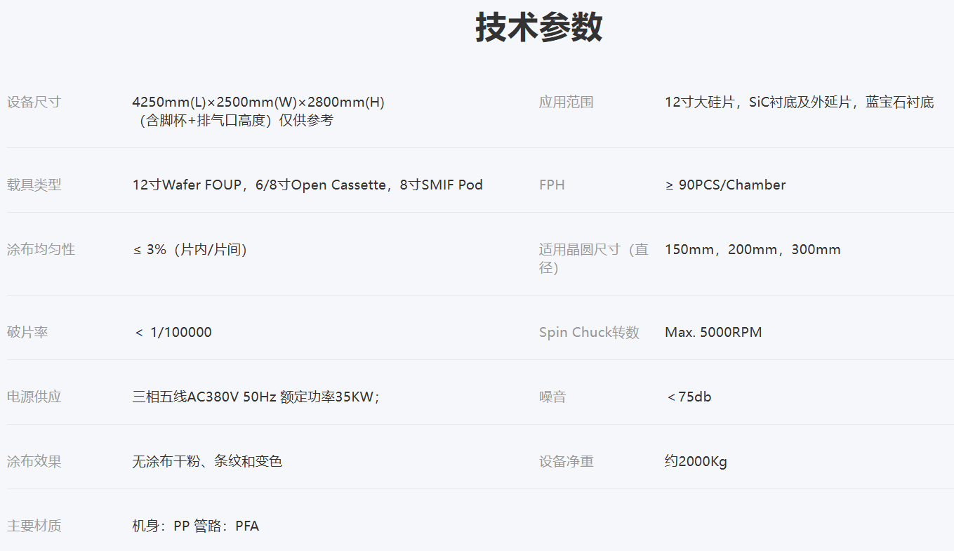 Equipment size: 4250 mm (L) x 2500 mm (W) x 2800 mm (H) (including goblet + vent height) are for reference only application range: 12 inches large wafers, SiC substrate and epitaxial wafer, sapphire substrate vehicle type: 12-inch Wafer foups, 6/8 inch Open Cassette, 8 inch SMIF Pod FPH: 90 PCS/Chamber or higher coating uniformity: 3% or less (inside/pills) for Wafer size (diameter) : 150 mm, 200 mm, 300 mm fragment rate: < 1/100000 Spin Chuck revolutions: Max. 5000 RPM power supply: three-phase five line AC380V 50 hz power rating 35 kw; Noise: < 75 db coating effect: no coating powder, stripes and color changing equipment net weight: 2000 kg main material: the fuselage: PP pipeline: PFA