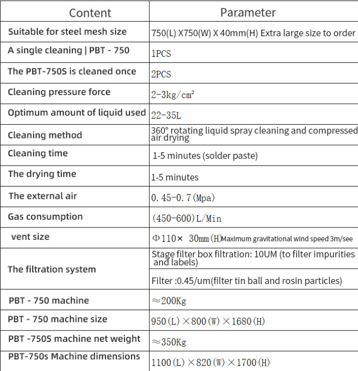 The PBT-750/750S is an environmentally friendly cleaning equipment that offers fast cleaning, high integration, and a compact structure. It is suitable for cleaning various types of meshes such as steel mesh, copper mesh, micro-perforated mesh, and wafer plates. It is also suitable for cleaning PCB misprinted boards, fixtures, scrapers, and similar products and tools. Widely used in the electronics manufacturing field, it can efficiently remove residues like solder paste and red adhesive, featuring safety, environmental protection, and high efficiency. The equipment is entirely powered by compressed air, requiring no electricity, which fundamentally eliminates fire hazards, making it especially suitable for flammable, explosive, or highly safety-conscious work environments.
